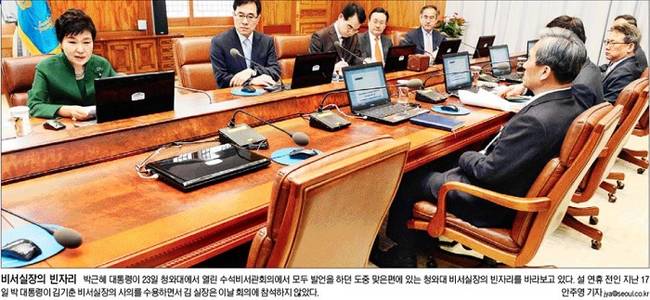 김기춘 청와대 비서실장의 빈자리를 조명한 신문도 있었다. 서울신문은 이날 ‘비서실장의 빈자리’라는 제목의 사진을 1면에 게재하며 “설 연휴 전인 지난 17일 박 대통령이 김 비서실장의 사의를 수용하면서 김 실장은 23일 청와대에서 열린 수석비서관회의에 참석하지 않았다”고 전했다.