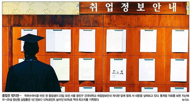한겨레는 “학위수여식을 마친 한 졸업생이 23일 오전 서울 광진구 건국대학교 취업정보안내 게시판 앞에 멈춰 서 내용을 살펴보고 있다”며 “통계청 자료를 보면 지난해 15~29살 청년층 실업률은 1년 전보다 1.0%포인트 높아진 9.0%로 역대 최고치를 기록했다”고 보도했다.