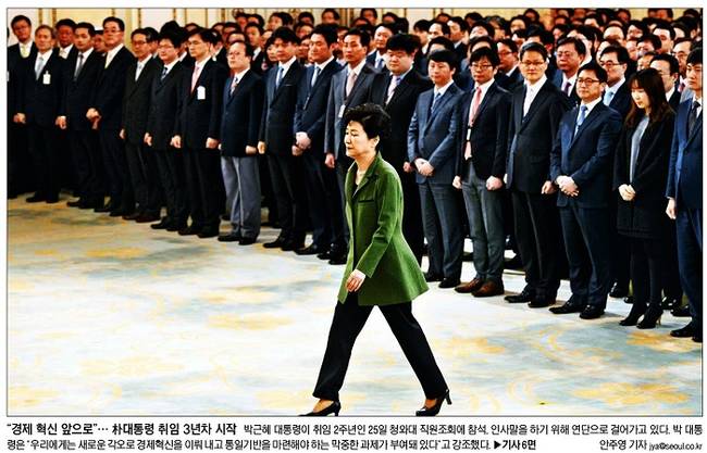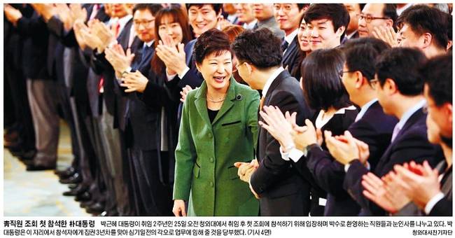 박근혜 대통령이 25일 취임 2주년을 직원 조회로 기념했다. 박 대통령이 청와대 직원 조회에 참석한 것은 처음이다. 26일 대다수의 주요 신문들은 집권 3년차를 맞은 박 대통령의 모습을 1면 사진으로 게재했다.