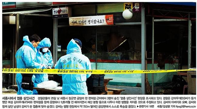 한겨레는 이날 경찰관들이 25일 낮 세종시 장군면 금암리 한 편의점 근처에서 엽총 살인사건 현장을 조사하는 모습을 1면 사진으로 실었다. 한겨레는 “경찰은 강아무개(50)씨가 동거했던 여성 김아무개(47)씨와 편의점을 함께 운영하다 1년6개월 전 헤어지면서 재산 분할 등으로 다투다 이런 범행을 저지른 것으로 추정하고 있다”며 “강씨는 범행 현장에서 약 700m 떨어진 금강변에서 스스로 목숨을 끊었다”고 보도했다.