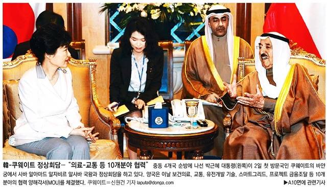 국민일보, 동아일보는 박 대통령이 쿠웨이트 바얀궁에서 셰이크 알 아흐마드 알 자베르 알 사마 국왕과 정상회담을 하는 사진을 보도했다. 동아는 “양국은 이날 보건의료, 교통, 유전개발 기술, 스마트그리드, 프로젝트 금융조달 등 10개 분야의 협력 양해각서(MOU)를 체결했다”고 전했다.