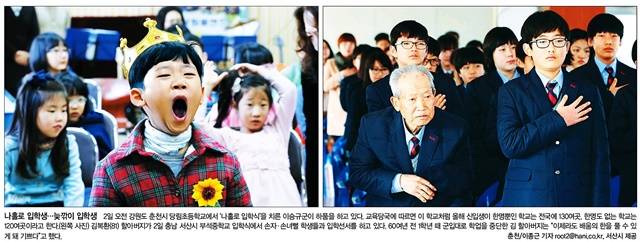 한겨레는 ‘나홀로 입학생… 늦깎이 입학생’이라는 제목의 1면 사진을 통해 신입생이 한명뿐인 강원도 춘천시 당림초등학교 입학식과 김복환(81) 할아버지가 입학한 충남 서산시 부석중학교의 입학식 모습을 나란히 전했다. 한겨레는 “올해 신입생이 한명뿐인 한교는 전국에 130여곳, 한명도 없는 학교는 120여곳이라고 한다”면서 “60여년 전 1학년 때 군입대로 학업을 중단한 김 할아버지는 “이제라도 배움의 한을 풀 수 있게 돼 기쁘다”고 했다”고 전했다.