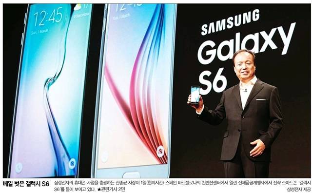 지난 1일(현지시간) 삼성전자가 스페인 바르셀로나에서 전략 스마트폰 ‘갤럭시S6’와 ‘갤럭시S6 엣지’를 공개했다. 한국일보는 관련 사진을 1면에 보도하며 “삼성전자의 휴대폰 사업을 총괄하는 신종균 사장이 1일 스페인 바르셀로나의 컨벤션센터에서 열린 신제품 공개행사에서 전략 스마트폰 ‘갤럭시S6’를 들어보이고 있다”고 전했다.