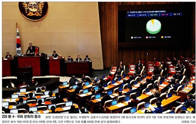 국회가 3일 본회의를 열고 ‘김영란법’(부정청탁 및 금품 등 수수 금지에 관한 법률)을 통과시켰다. ‘반부패’에 대한 기대와 ‘위헌소지·과잉입법’이라는 우려가 공존하는 가운데 재석의원 247명 중 찬성 226명, 반대 4명, 기권 17명으로 공식 법제화됐다.