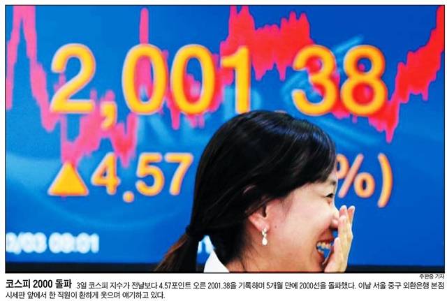 조선일보는 5개월만에 코스피가 2000선을 돌파했다며 서울 중구 외환은행 본점 시세판 앞에서 한 직원이 환하게 웃는 모습을 전했다. 또 한겨레는 ‘3월의 눈 시샘속 개구리 봄노래’라는 제목의 1면 사진에서 눈이 쌓인 길과 계곡의 개구리 사진을 나란히 실었다.