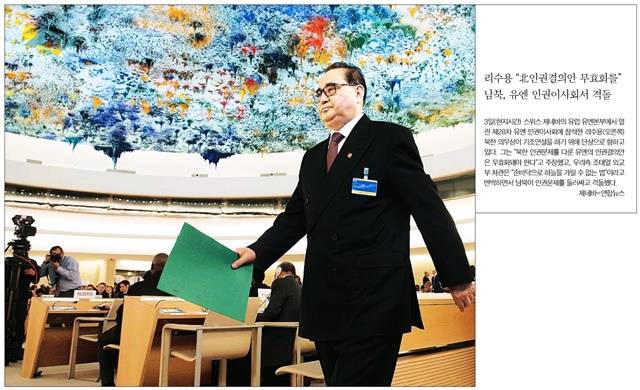 남북이 3일(현지시간) 스위스 제네바의 유엔본부에서 열린 유엔 인권이사회에서 격돌했다. 한국일보는 리수용 북한 외무상이 기조연설을 하기 위해 단상으로 향하는 모습을 1면에 실었다. 그러면서 “그는 ‘북한 인권문제를 다룬 유엔의 인권결의안은 무효화돼야 한다’고 주장했고, 우리측 조태열 외교부 차관은 ‘손바닥으로 하늘을 가릴 수 없는 법’이라고 반박하면서 남북이 인권문제를 둘러싸고 격돌했다”고 보도했다.