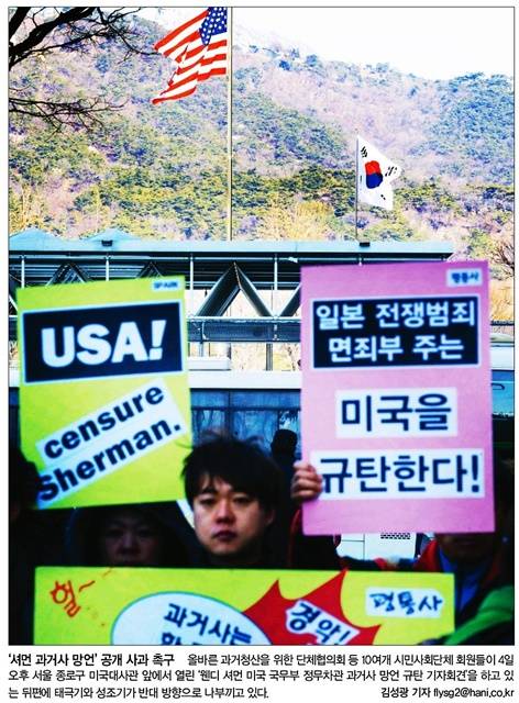 웬디 셔먼 미국 국무부 차관이 한중일 과거사를 덮어야 한다는 일본 편향적 발언을 해 비판 여론이 거세다. 한겨레는 1면을 통해 ‘올바른 과거청산을 위한 단체협의회’ 등 10여개 시민사회단체 회원들이 4일 오후 서울 종로구 미국 대사관 앞에서 규탄 기자회견을 하는 모습을 보도했다.