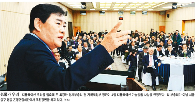 최경환 경제부총리 겸 기획재정부 장관이 한국의 디플레이션 가능성을 언급했다. 동아일보는 “디플레이션 우려를 일축해 온 최경환 경제부총리 겸 기획재정부 장관이 4일 디플레이션 가능성을 사실상 인정했다”면서 최 부총리가 이날 서울 중구 명동 은행연합회관에서 조찬강연을 하는 것을 1면 사진으로 실었다.