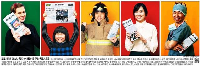 조선일보가 창간 95주년 특집호를 발행했다. 조선을 1면 사진을 통해 일반독자의 모습을 전하며 “조선일보 95년은 한국을 배우러 온 외국인, 나눗셈을 익히기 시작한 꼬마, 목숨을 구하러 불길에 뛰어든 소방관, 자산 가치를 내다보는 은행원, 죽을 각오로 국경을 넘은 탈북자 같은 독자 여러분의 동행으로 함께 일군 역사”라고 밝혔다.