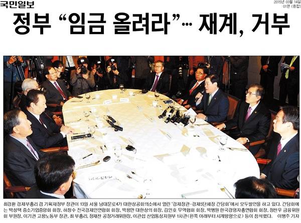 최경환 경제부총리가 경제 5단체장과 간담회를 연 사진도 1면에 게재됐다. 중앙일보는 “경제장관ㆍ경제5단체장 간담회가 13일 서울 대한상공회의소에서 열렸다”며 “이 자리에서 최경환 경제부총리는 ‘기업들이 적정 수준으로 임금을 올려 소비 회복에 힘을 모아달라’고 주문했다”고 밝혔다.
