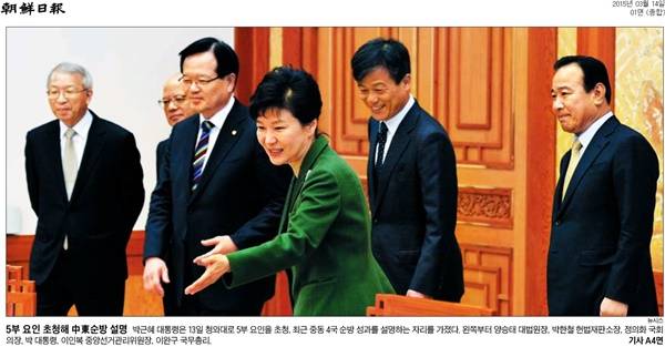 동아일보는 “대통령 순방 직후 5부 요인을 청와대로 초청한 것은 현 정부 들어 처음”이라며 “왼쪽부터 양승태 대법원장, 박한철 헌법재판소장, 정의화 국회의장, 박 대통령, 이인복 중앙선거관리위원장, 이완구 국무총리”라고 밝혔다.