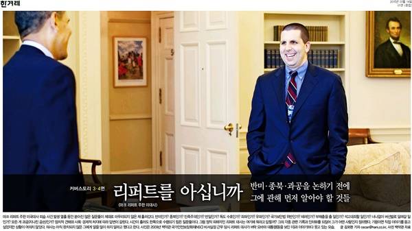 한겨레는 ‘리퍼트를 아십니까’로 1면 커버스토리를 장식했다. 한겨레는 ‘반미ㆍ종북ㆍ과공을 논하기 전에 그에 관해 먼저 알아야 할 것들’이라는 부제로 “마크 리퍼트 주한 미국대사 피습 사건 발생 열흘 동안 쏟아진 많은 질문들이 제대로 마무리되지 않은 채 흘러갔다”며 “정치적 견해와 사회ㆍ경제적 처지에 따라 답변이 갈린다. 정작 피해자인 리퍼트 대사는 여기에 뭐라고 답할지 그의 각종 관련 기록과 인터뷰를 되짚어 그가 어떤 사람인지 정리했다”고 밝혔다. 사진은 2009년 백악관 국가안전보장회의(NSC) 비서실장 근무 당시 버락 오바마 대통령과 이야기하다 웃고 있는 모습이다.