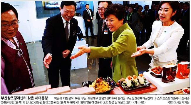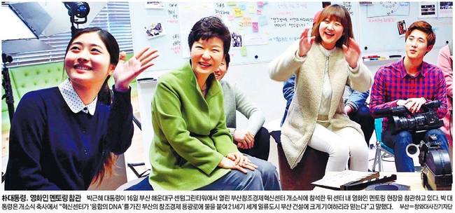 국민·동아·조선·중앙일보는 박 대통령이 16일 부산 해운대구 센텀그린타워에 들어선 부산창조경제혁신센터 내 스마트스튜디오를 신동빈 롯데그룹 회장 등과 함께 둘러보고 있는 사진을 실었다. 서울신문과 세계일보는 박 대통령이 센터 내 영화인 멘토링 현장을 참관하고 있는 사진을 선택했다. 박 대통령은 센터 개소식 축사에서 “혁신센터가 ‘융합의 DNA’를 가진 부산의 창조경제 용광로에 불을 붙여 21세기 세계 일류도시 부산 건설에 크게 기여하리라 믿는다”고 말했다고 세계일보는 전했다.
