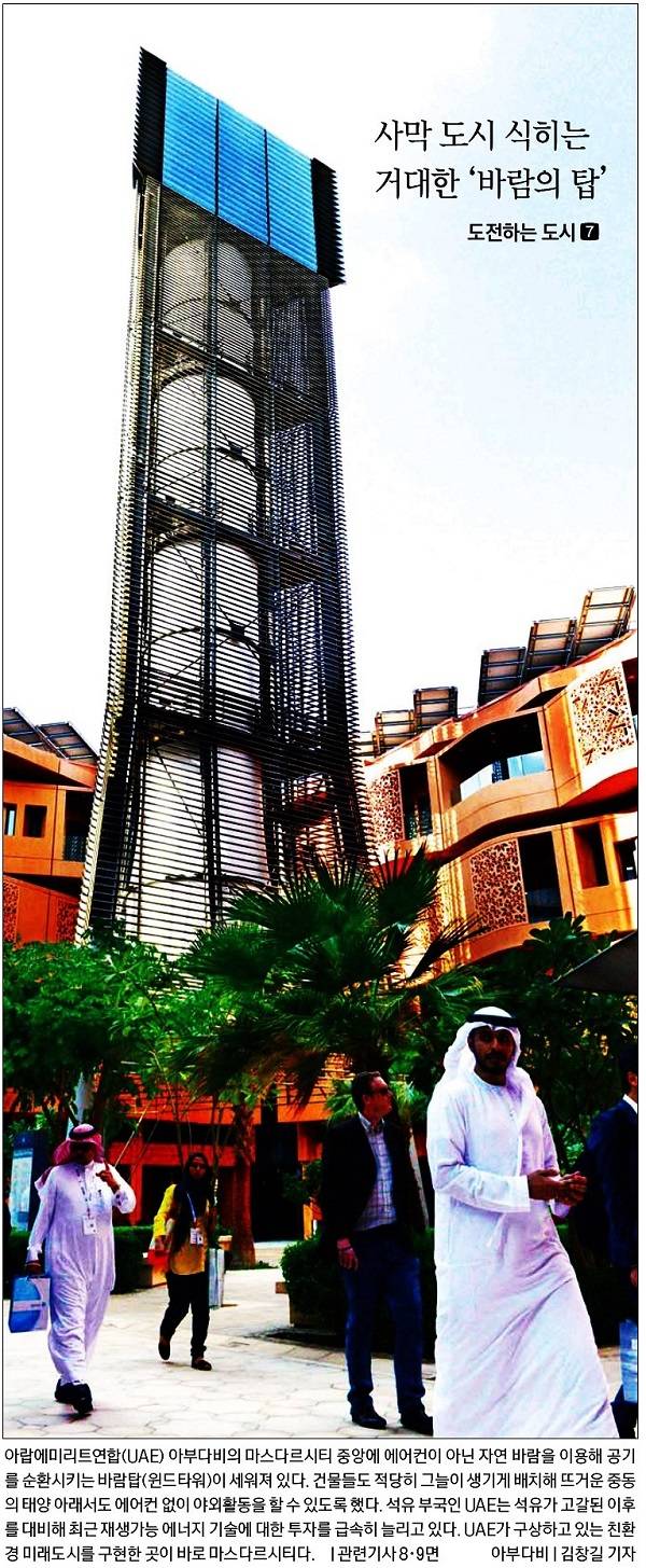 경향신문은 ‘도전하는 도시’ 일곱 번째 시리즈로 사막 도시를 식히는 거대한 바람의 탑 사진을 1면에 실었다. 아랍에미리트연합(UAE) 아부다비의 마스다르시티 중앙에 설치된 이 바람탑(윈드타워)는 자연 바람을 이용해 공기를 순환시키는 방식이라고 경향은 설명했다. 마스다르시티는 UAE가 구상하고 있는 친환경 미래도시를 구현한 곳이다.
