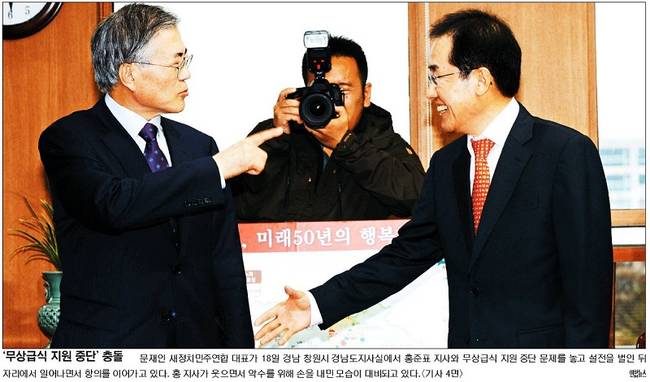 국민일보와 동아일보는 이날 면담이 끝난 뒤 악수를 청하는 홍 지사와 달리 무상급식 지원 중단에 대한 항의를 이어가는 문 대표의 대비되는 모습을 포착했다. 동아일보는 “면담 직후 홍 지사가 악수를 청했지만 문 대표는 ‘무상급식도 안 해놓고’라며 응하지 않았다”고 전했다.