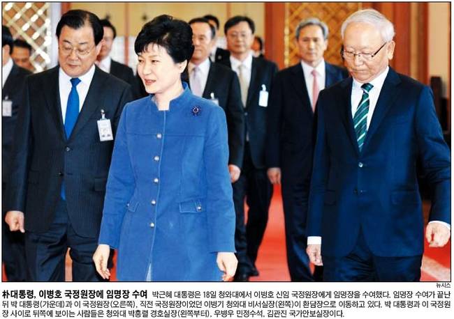 조선일보는 박근혜 대통령이 18일 청와대에서 이병호 신임 국정원장에게 임명장을 수여한 뒤 이 국정원장, 직전 국정원장이었던 이병기 청와대 비서실장이 환담장으로 이동하는 모습을 1면에 보도했다. 한국일보는 총선에서 승리를 거둬 네 번째 집권이 유력해진 베냐민 네타냐후 이스라엘 총리가 18일 주먹을 불끈 쥔 채 지지자들의 환호에 답하고 있는 사진을 실었다.