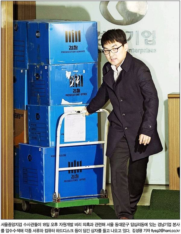 검찰이 성공불융자금을 횡령한 혐의를 잡고 한국석유공사와 경남기업을 18일 압수수색하면서 이명박 정부 자원외교에 대한 본격 수사에 나섰다. 한겨레 1면 보도다. 한겨레는 이날 서울중앙지검 수사관들이 자원개발 비리 의혹과 관련해 경남기업 본사를 압수수색해 각종 서류와 컴퓨터 하드디스크 등이 담긴 상자를 들고 나오고 있는 사진을 1면에 함께 실었다.
