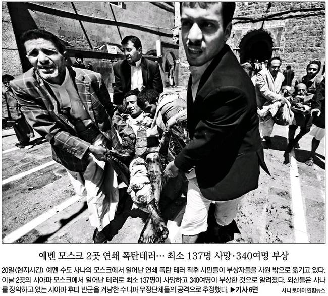20일(현지시간) 예맨 수도 사나의 모스크에서 연쇄 폭탄 테러가 발생해 최소 137명이 사망하고 340여명이 부상했다. 서울신문은 폭탄 테러 직후 시민들이 부상자들을 사원 밖으로 옮기고 있는 사진을 흑백으로 처리해 1면에 실었다. 서울신문은 “외신들은 사나를 장악하고 있는 시아파 후티 반군을 겨냥한 수니파 무장단체들의 공격으로 추정했다”고 전했다.