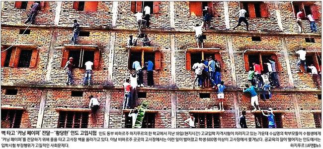 경향신문은 인도 동부 비하르주 하지푸르의 한 학교에서 수십 명의 사람들이 벽을 타고 오르는 사진을 1면에 실었다. 이들은 고교입학 자격시험을 치르고 있는 수험생 자녀에게 ‘커닝 페이퍼’를 전달하기 위해 위험을 무릅쓰고 줄을 타고 벽을 올랐다. 경향은 “이날 비하르주 곳곳의 고사장에서는 이런 일이 벌어졌고 학생 600명 이상이 고사장에서 쫓겨났다”고 전하며 “공교육의 질이 떨어지는 인도에서는 입학시험 부정행위가 고질적인 사회문제”라고 지적했다.