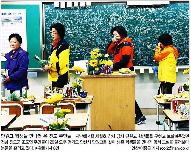 지난해 4월16일 발생한 세월호 참사 당시 가장 먼저 현장에 달려가 경기도 안산 단원고 학생들을 구조하고 보살펴주었던 전남 진도군 조도면 주민들과 생존 학생들이 20일 단원고에서 다시 만났다. 세계일보와 한겨레는 희생 학생들의 책상 위에 놓인 꽃과 사진, 무사귀환을 기원하는 글들로 칠판이 가득찬 교실을 둘러보며 울먹이는 진도 주민들의 사진을 1면에 실었다.