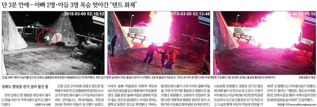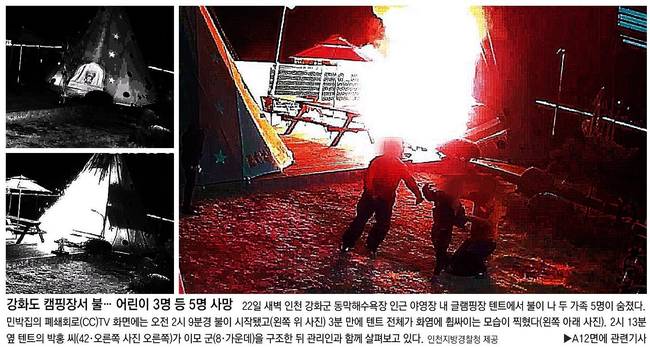 경향신문, 국민일보, 동아일보, 서울신문, 세계일보, 중앙일보, 한겨레, 한국일보 등은 23일자 1면 사진으로 전날 새벽 7명의 사상자를 낸 인천 강화군 동막해수욕장 인근 글램핑장 화재 현장 모습을 담았다.