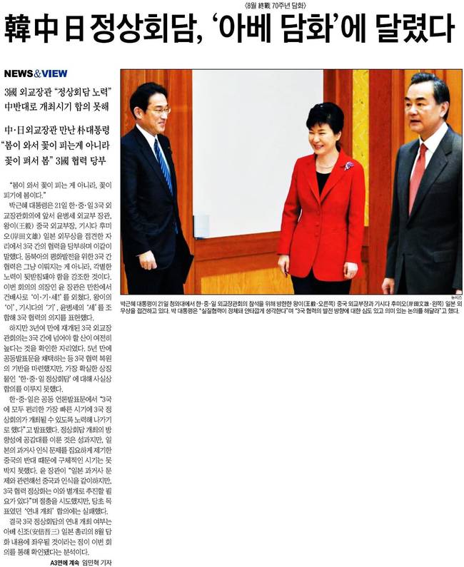조선일보는 이날 1면 사진기사를 통해 박근혜 대통령이 21일 청와대에서 한·중·일 외교장관회의 참석을 위해 방한한 왕이 중국 외교부장과 기시다 후미오 일본 외무상을 접견한 모습을 전했다.