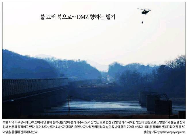 경향신문은 24일자 1면 사진으로 북한 지역 비무장지대(DMZ)에서 난 불이 철책선을 넘어 경기 파주시 도라산 인근으로 번지자 소방헬기가 불길을 잡기 위해 분주히 움직이는 모습을 담았다.
