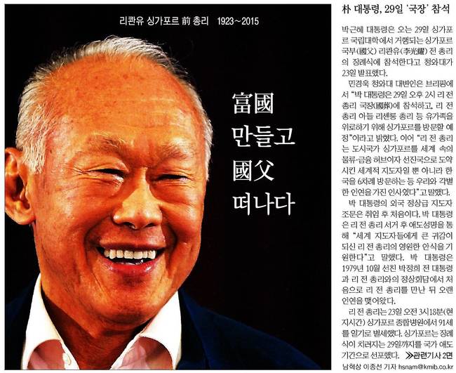 국민일보, 서울신문, 세계일보, 조선일보 등은 말레이 반도 남단의 가난한 도시국가를 '아시아의 용'으로 성장시켜 '싱가포르 국부'로 불리던 리콴유 전 싱가포르 총리가 23일 오전 3시18분(현지시간) 폐렴으로 영면한 사실을 전하며 리콴유 전 총리의 사진을 실었다.