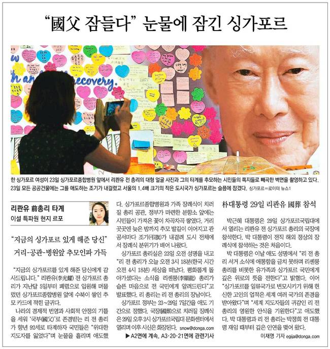 동아일보는 한 싱가포르 여성이 23일 싱가포르종합병원 앞에서 리콴유 전 총리의 대형 얼굴 사진과 그의 타계를 추모하는 시민들의 쪽지들로 빼곡한 벽면을 촬영하는 모습을 담았다.