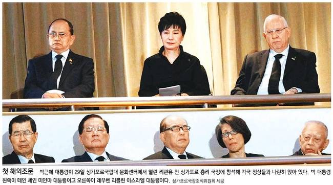박근혜 대통령이 리 전 총리의 장례식에 참석한 모습을 1면 사진으로 담은 신문도 있었다. 동아일보는 ‘첫 해외조문’이라는 제목의 사진을 통해 “박 대통령이 싱가포르국립대 문화센터에서 열린 리 전 총리 국장에 참석해 각국 정상들과 나란히 앉았다”며 “박 대통령 왼쪽에는 테인 세인 미얀마 대통령이 앉았고, 오른쪽에는 레우벤 리블린 이스라엘 대통령이 앉았다”고 전했다.