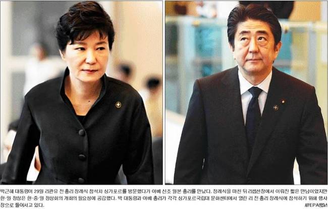 박 대통령이 리 전 총리 장례식에 참석했다 아베 신조 일본 총리를 만난 것을 주목한 신문도 있었다. 국민일보는 박 대통령과 아베 총리가 각각 리 전 총리 장례식장에 들어서는 모습을 묶어서 1면 사진으로 보도했다. 국민일보는 “박 대통령은 아베 총리를 만나 ‘한·중·일 3국 외교장관회의에서 합의한 대로 앞으로 필요한 조치를 잘 취해 나가자’고 밝혔다”면서 “아베 총리는 이에 대해 ‘최근 3국 외교장관 회의의 성공적인 개최에 감사드리며, 의장국으로서 역할을 해주신 것을 평가한다’고 말했다”고 전했다.