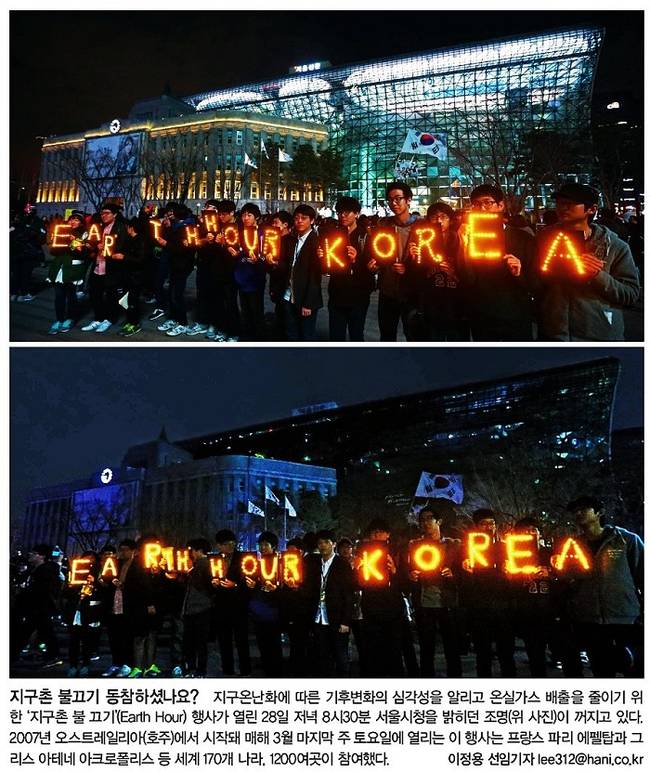 28일 저녁 ‘지구촌 불끄기’ 행사를 1면 사진으로 담은 신문도 있었다. 한겨레는 28일 저녁 8시30분 서울시청을 밝히던 조명이 꺼지는 모습을 1면 사진으로 전하며 “이날 지구온난화에 따른 기후변화의 심각성을 알리고 온실가스 배출을 줄이기 위한 ‘지구촌 불끄기’ 행사가 열렸다”고 보도했다. 한겨레는 “이 행사는 2007년 오스트레일리아에서 시작돼 매해 3월 마지막 주 토요일에 열리고 있다”며 “프랑스 파리 에펠탑과 그리스 아테네 아크로폴리스 등 세계 170개 나라, 1200여곳이 참여했다”고 전했다.