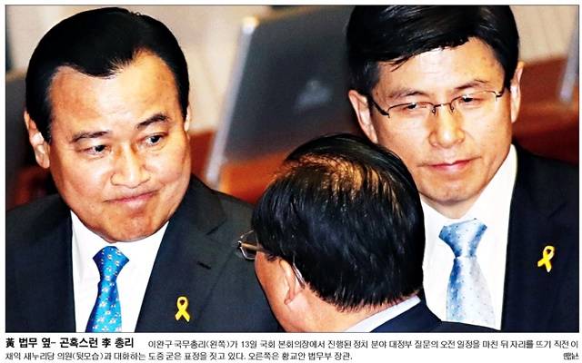 국민일보와 서울신문은 황교안 법무부 장관과 이 총리의 모습을 나란히 실었다. 국민은 ‘黃 법무 옆… 곤혹스런 李 총리’라는 제목의 1면 사진에서 “이완구 국무총리가 13일 국회 본회의장에서 진행된 정치 분야 대정부 질문의 오전 일정을 마친 뒤 자리를 뜨기 직전 이채익 새누리당 의원과 대화하는 도중 굳은 표정을 짓고 있다”고 보도했다.