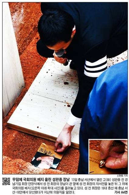 조선일보는 성 전 회장의 안장식에서 그의 장남이 관 옆에 성 전 회장의 자서선을 놓은 뒤 그 위에 국회의원 배지를 올려놓는 모습을 1면에 실었다. 성 전 회장은 지난 19대 총선 때 당선됐다가 지난해 의원직을 잃었다.