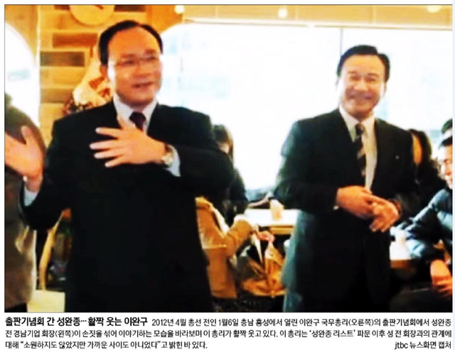 경향은 성 전 회장이 지난 2013년 재선거를 앞두고 이 총리의 부여 선거사무소를 방문해 차에서 비타500 박스를 꺼내 전달했다며 구체적 정황을 진술했다고 보도했다. 1면 사진은 지난 2012년 충남 홍성에서 열린 이 총리의 출판기념회에 성 전 회장이 참석한 모습이었다.