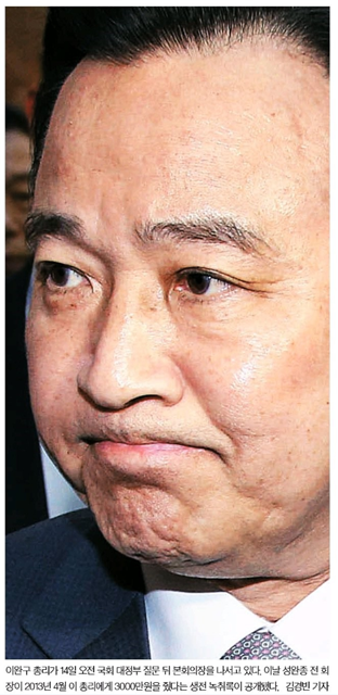 이어 중앙일보는 성 전 회장의 비망록에서 성 전 회장과 이 총리가 2013년 8월부터 지난달까지 20개월간 모두 23차례 만난 기록이 확인됐다고 전하며, 1면 사진을 통해 지난 14일 오전 국회 대정부질문을 나서며 입술을 앙다문 이 총리의 모습을 보도했다.