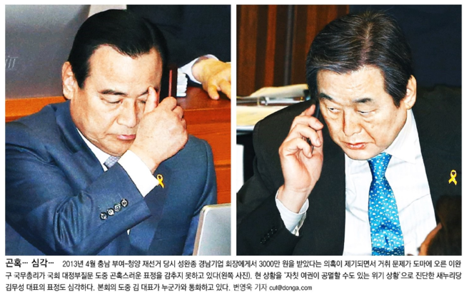 동아일보는 ‘곤혹… 심각…’이라는 제목의 1면 사진을 통해 국회 대정부질문에서 곤혹스러운 표정을 감추지 못하는 이 총리와 “현 상황을 자칫 여권이 공멸할 수도 있는 위기 상황으로 진단한” 김무성 새누리당 대표의 심각한 표정을 나란히 실었다.