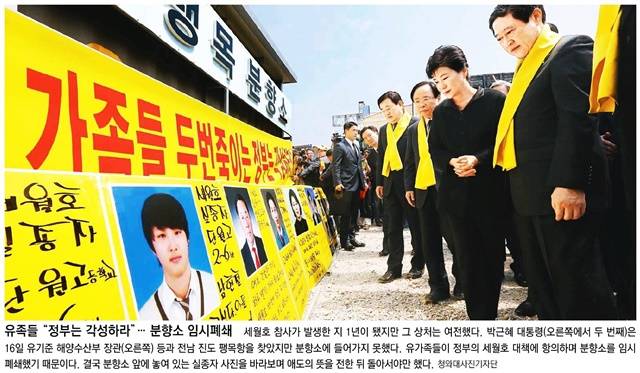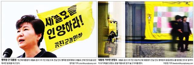 박근혜 대통령은 이날 오후 전남 진도 팽목항을 찾아 세월호 선체 인양 등을 담은 대국민 담화를 발표했다. 그러나 국가의 미온적인 대책에 항의하던 유가족들은 팽목항 분향소를 폐쇄하고 자리를 떴다. 경향신문과 조선일보는 팽목항에 간 대통령의 모습과 유족들의 빈자리를 나란히 실었다.
