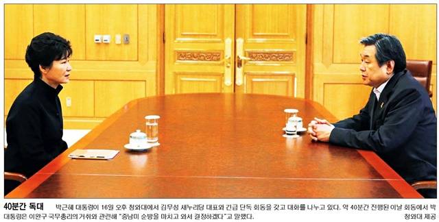 한편 국민일보와 세계일보는 16일 오후 박 대통령과 김무성 새누리당 대표가 긴급 단독 회동을 갖고 독대하는 모습을 1면에 실었다. 국민은 “약 40분간 진행된 이날 회동에서 박 대통령은 이완구 국무총리의 거취와 관련해 ‘중남미 순방을 마치고 와서 결정하겠다’고 말했다”고 보도했다.