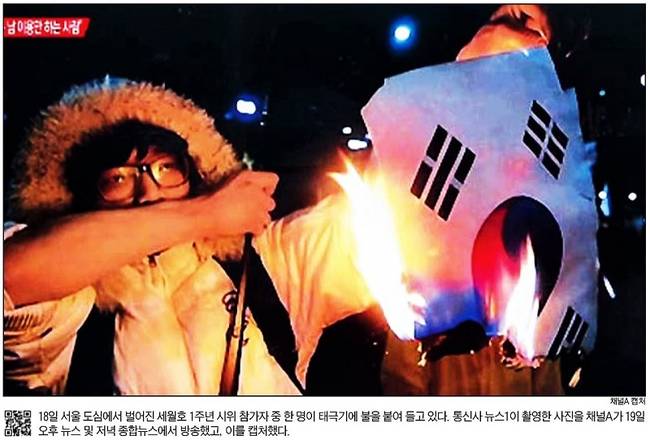 조선일보는 ‘태극기 불태운 시위대’란 제목의 1면 머리기사에 지난 18일 세월호 1주년 시위 참가자 중 한 명이 태극기에 불을 붙여 들고 있는 사진을 실었다. 조선은 “세월호 추모 집회에 참가한 시위대 수천 명이 서울 광화문 일대 도로를 불법 점거하고 시위를 벌여 도심 교통이 극심한 정체를 빚었다”며 시위대의 ‘불법 행위’를 강조했다. 경찰이 시위대의 행진이 시작되기도 전부터 도로 등을 전면 통제했다는 사실은 감췄다. 부상 등 피해 규모도 경찰 쪽만 강조했다. 조선은 “경찰은 또 시위 중 태극기를 불태운 남성의 신원을 추적 중이며, 대한민국을 모독할 목적으로 태극기를 태웠는지 조사할 방침”이라고 전했다.