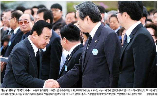 20일 주요 일간지 1면에 등장한 이 총리는 ‘성완종 리스트’ 파문 초반에 당당하던 기세가 한 풀 꺾인 모습이었다. 경향신문과 세계일보는 이 총리가 19일 서울 강북구 국립4·19민주묘지에서 열린 제55주년 4·19혁명 기념식에서 비를 피하지 못해 우비를 입고 상념에 젖은 모습을 1면 사진으로 보도했다. 중앙일보는 이 총리가 4·19혁명 기념식 시작 전 김무성 대표와 악수를 하면서 고개를 숙이고 있는 사진을 실었다. 중앙은 이날 1면에서 “성완종 전 경남기업 회장과 이완구 총리가 최근 1년간 210여 차례 전화를 주고받은 것으로 나타났다”고 보도했다.