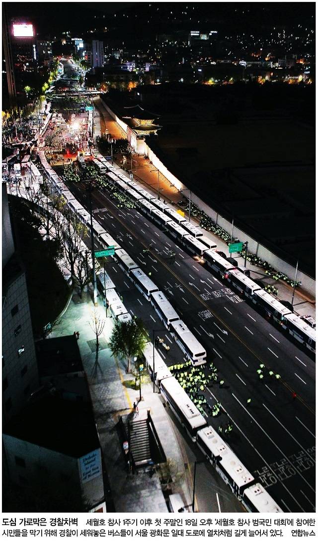 반면 한겨레는 지난 18일 ‘세월호 참사 범국민대회’에 참여한 시민들을 막기 위해 경찰이 세워놓은 버스들이 서울 광화문 일대 도로에 열차처럼 길게 늘어서 있는 사진을 1면에 싣고 ‘세월호 슬퍼할 자유마저 막는 나라’라는 제목을 달았다. 한겨레는 “가족 단위의 시민들이 다수 참여한 집회에 이례적으로 수사본부까지 설치하고 ‘끝까지 추적해 처벌하겠다’는 ‘공안정국식 대응’에 정치적 배경이 깔려 있다는 지적도 나온다”고 전했다.