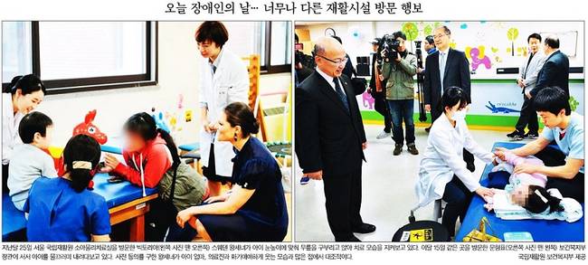 동아일보는 남미 순방 중인 박근혜 대통령이 콜롬비아 수도 보고타에서 열린 6·25전쟁 참전용사 가족 초청 간담회에 참석한 사진을 1면에 실었다. 한국일보는 장애인의 날(20일)을 맞아 지난달 25일 서울 국립재활원 소아물리치료실을 방문한 빅토리아 스웨덴 왕세녀가 아이 눈높이에 맞춰 무릎을 구부리고 앉아 치료 모습을 지켜보고 있는 사진과 이달 15일 같은 곳을 방문한 문형표 보건복지부 장관이 서서 아이를 물끄러미 내려다보고 있는 사진을 나란히 실으며 ‘장애인 눈맞춘 왕세녀…카메라 눈맞춘 文 복지’라는 제목을 붙였다.