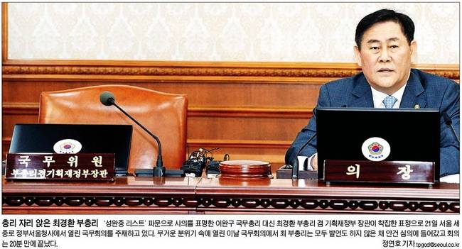 동아일보와 서울신문은 사의를 표명한 이완구 총리 대신 최경환 부총리 겸 기획재정부 장관이 21일 국무회의를 주재하고 있는 사진을 실었다. 서울신문은 “무거운 분위기 속에 열린 이날 국무회의에서 최 부총리는 모두 발언도 하지 않은 채 안건 심의에 들어갔고 회의는 20분 만에 끝났다”고 전했다.