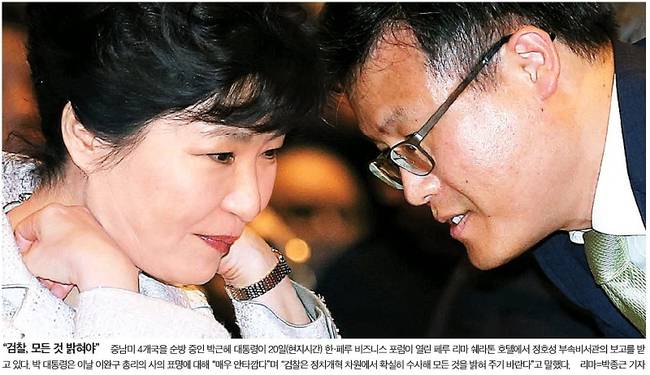 세계일보와 중앙일보는 중남미 4개국을 순방 중인 박근혜 대통령이 20일(현지시각) 페루 리마 쉐라톤 호텔에서 정호성 부속비서관의 보고를 받고 있는 사진을 1면에 보도했다. 박 대통령은 이날 이완구 총리의 사의 표명에 대해 “매우 안타깝다”며 “검찰은 정치개혁 차원에서 확실히 수사해 모든 것을 밝혀 주기 바란다”고 말했다고 중앙일보는 전했다.