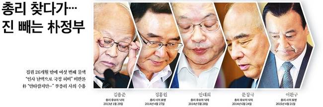 한국일보는 박근혜 정부 초대 총리 후보로 지명됐던 김용준 전 헌법재판소장부터 정홍원 전 총리, 안대희 전 대법관, 문창극 전 중앙일보 주필과 20일 사의를 표명한 이완구 총리까지 5명의 사진을 나란히 실었다. 한국일보는 “제대로 된 총리를 인선하지 못해 국정동력을 허비하는 일이 반복되면서 청와대의 취약한 인사시스템과 박근혜 대통령이 인재를 고르는 안목이 또다시 비판의 도마에 올랐다”고 지적했다.