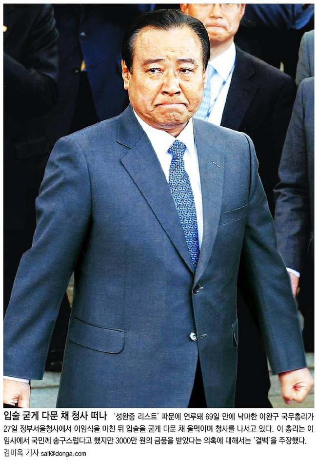 동아는 '입술 굳게 다문 채 청사 떠나'라는 1면 사진기사를 통해 이완구 국무총리가 27일 정부서울청사에서 이임식을 마친 뒤 입술을 굳게 다문 채 울먹이며 청사를 나서는 장면을 전했다.