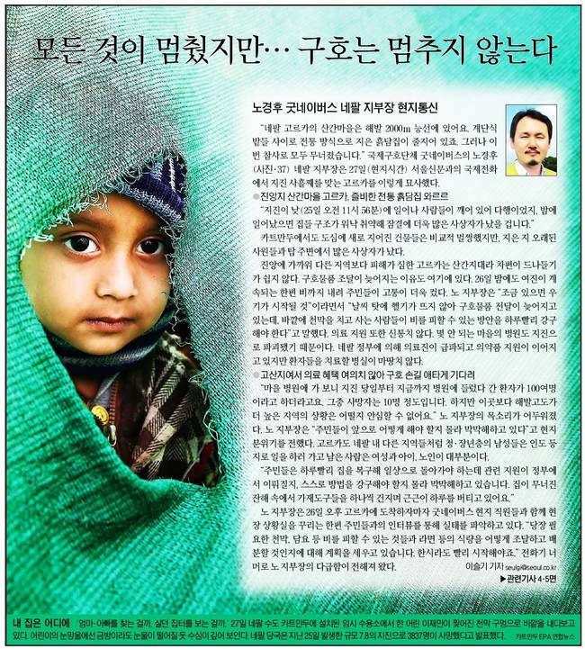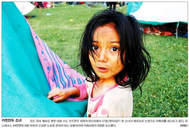 국민은 모든 것이 폐허로 변한 네팔 수도 카트만두 외곽의 피난처에서 27일(현지시간) 한 소녀가 애처로운 눈빛으로 카메라를 쳐다보고 있는 장면을 실었다.