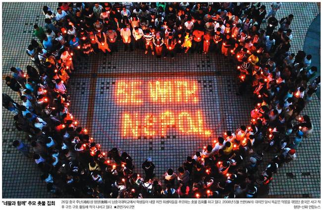 한국도 중국 후난성 항양시 남중국대학교에서 학생들이 네팔 지진 희생자들을 추모하는 촛불 집회를 하는 모습을 실었다. 2008년 5월 쓰촨 대지진 당시 똑같은 악몽을 겪었던 중국은 사고 직후 구조 활동에 적극 나서고 있다.