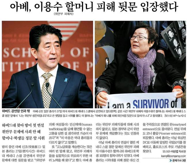 조선과 중앙은 미국을 공식 방문 중인 아베 신조 일본 총리가 27일 미국 하버드대 케네디스쿨에서 강연하는 모습과 아베 신조 일본 총리가 강연을 갖기 직전 일본군 위안부 피해자 이용수 할머니와 한인단체 관계자들이 케네디스쿨 앞에서 시위를 벌이는 모습을 게재했다.